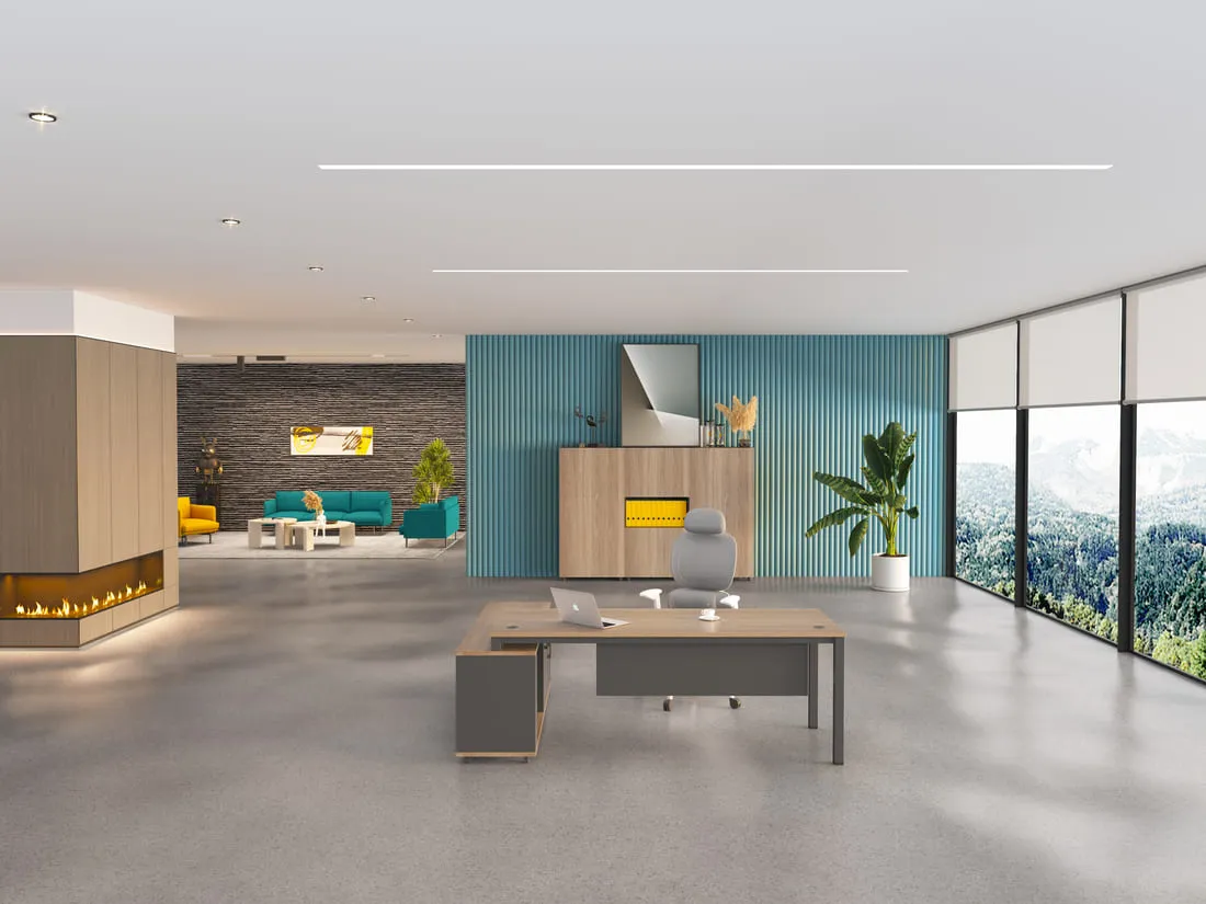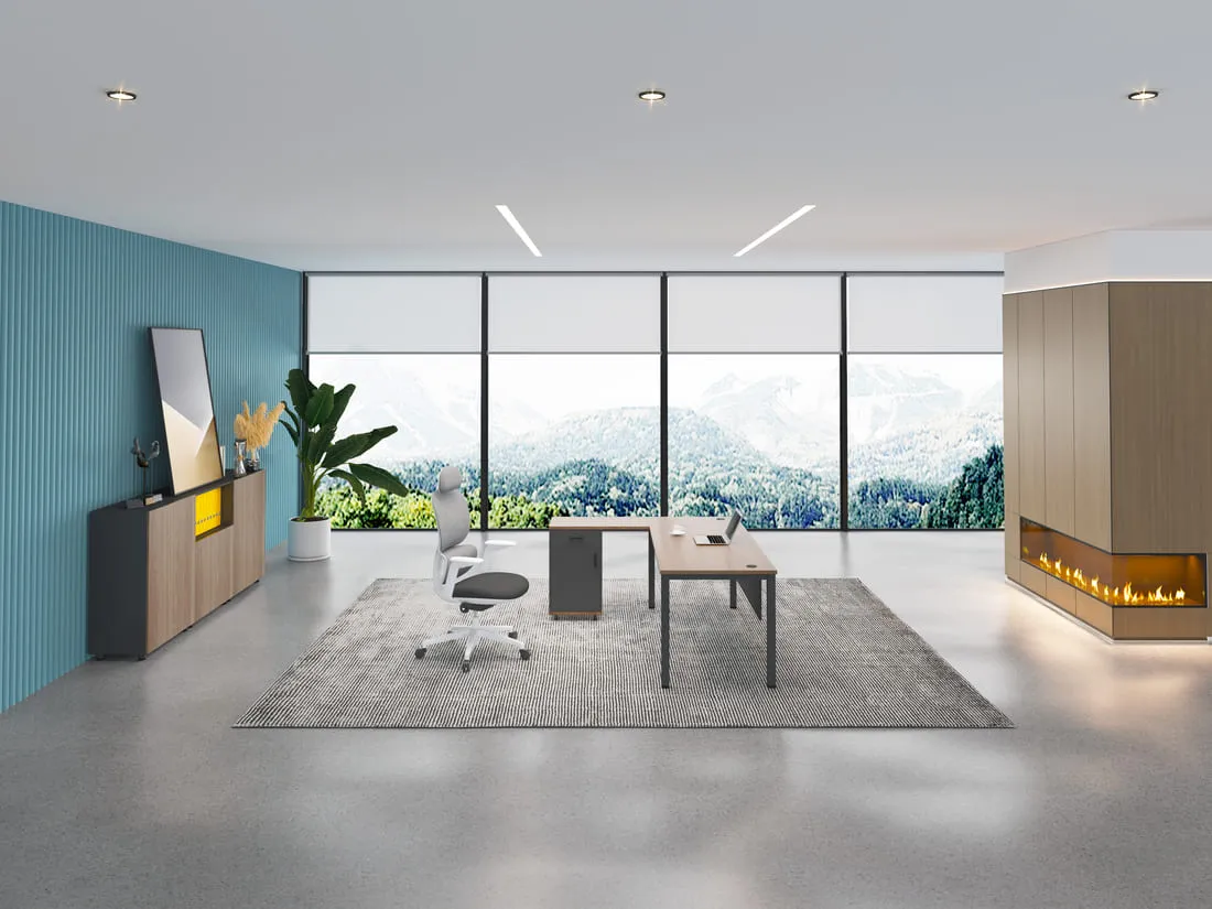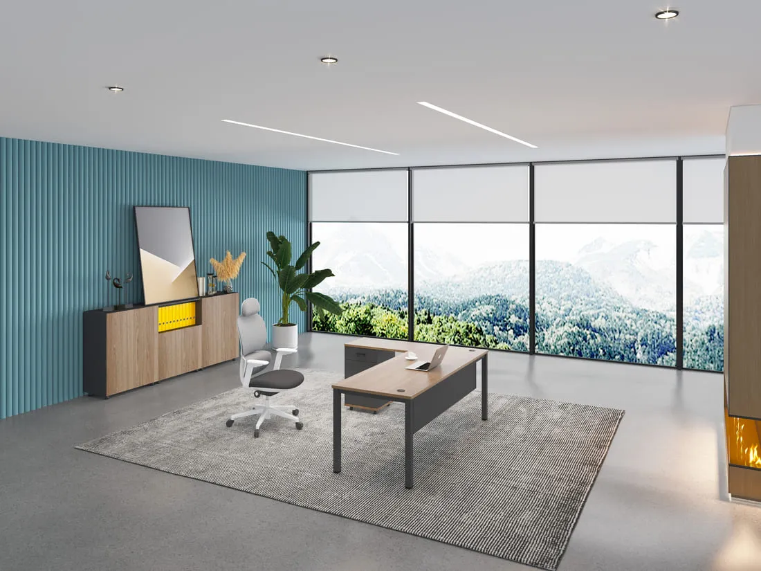 Generously proportioned with an integrated side cabinet, it facilitates impeccable organization and workflow efficiency.