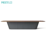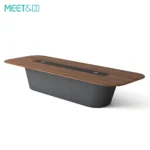Minotti Conference Table is a perfect blend of sophistication and functionality for your meeting room. Its modern boat-shaped design and luxurious dark finish make a bold statement, while the heavy-duty base ensures durability. The table also features convenient pop-up sockets for easy power access, ideal for high-level meetings and presentations.
