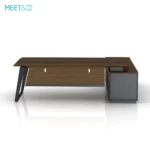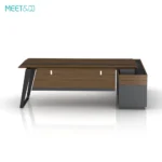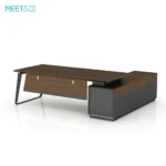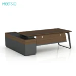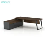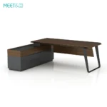 The wooden part of the table is dark brown and the metal part is black. The overall tone is calm and elegant, which is very suitable for modern office environments. The design of the table is simple and elegant, with smooth lines. The desktop is L-shaped, providing ample office space. The table legs are uniquely designed and use sloping metal brackets to increase the stability and beauty of the table.