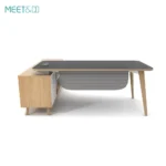 The desk legs boast meticulously crafted wood details that transition smoothly into the worktop, embodying a unified and sophisticated design language.